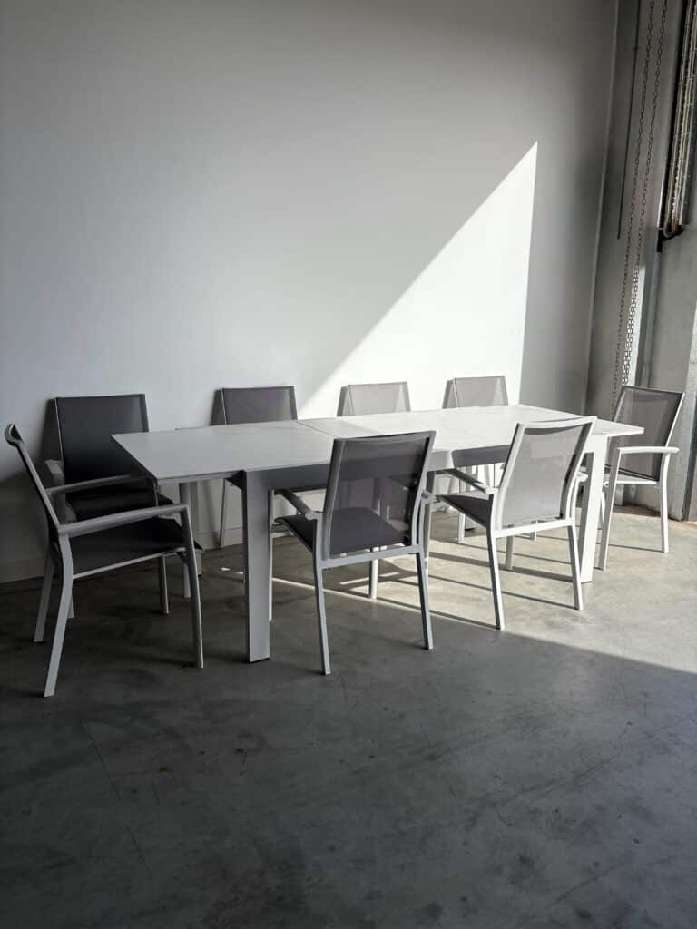 With its refined lines and sleek light-grey cushions, it feels like a European bistro set transplanted into your backyard. The aluminium frame stands up well to sun, rain, and seasons without rusting or fading.